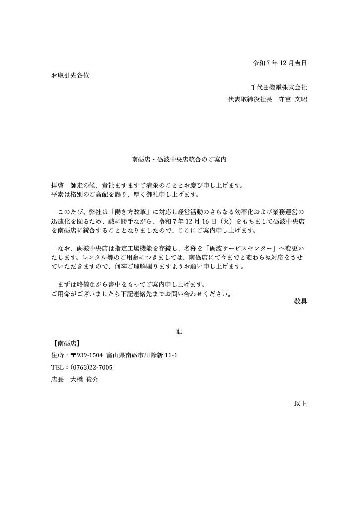 令和7年12月16日(火)をもちまして砺波中央店を南砺店に統合することとなりましたので、ここにご案内申し上げます。同店をご利用いただきましたお取引先様には、多大なご不便をおかけしますが、ご理解のほどよろしくお願いします。
